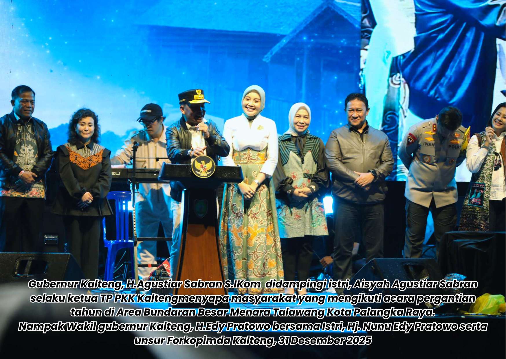 Gubernur Kalteng, H. Agustiar Sabran dalam sambutannya menyampaikan bahwa, “Malam pergantian tahun baru kali ini tidak kita isi dengan perayaan kembang api, tetapi dengan doa bersama lintas agama untuk bangsa dan konser amal untuk saudara kita di Sumatera yang tertimpa bencana, semoga diberikan kekuatan agar bisa segera bangkit dari keadaan yang mennimpa saudara kita disana”.