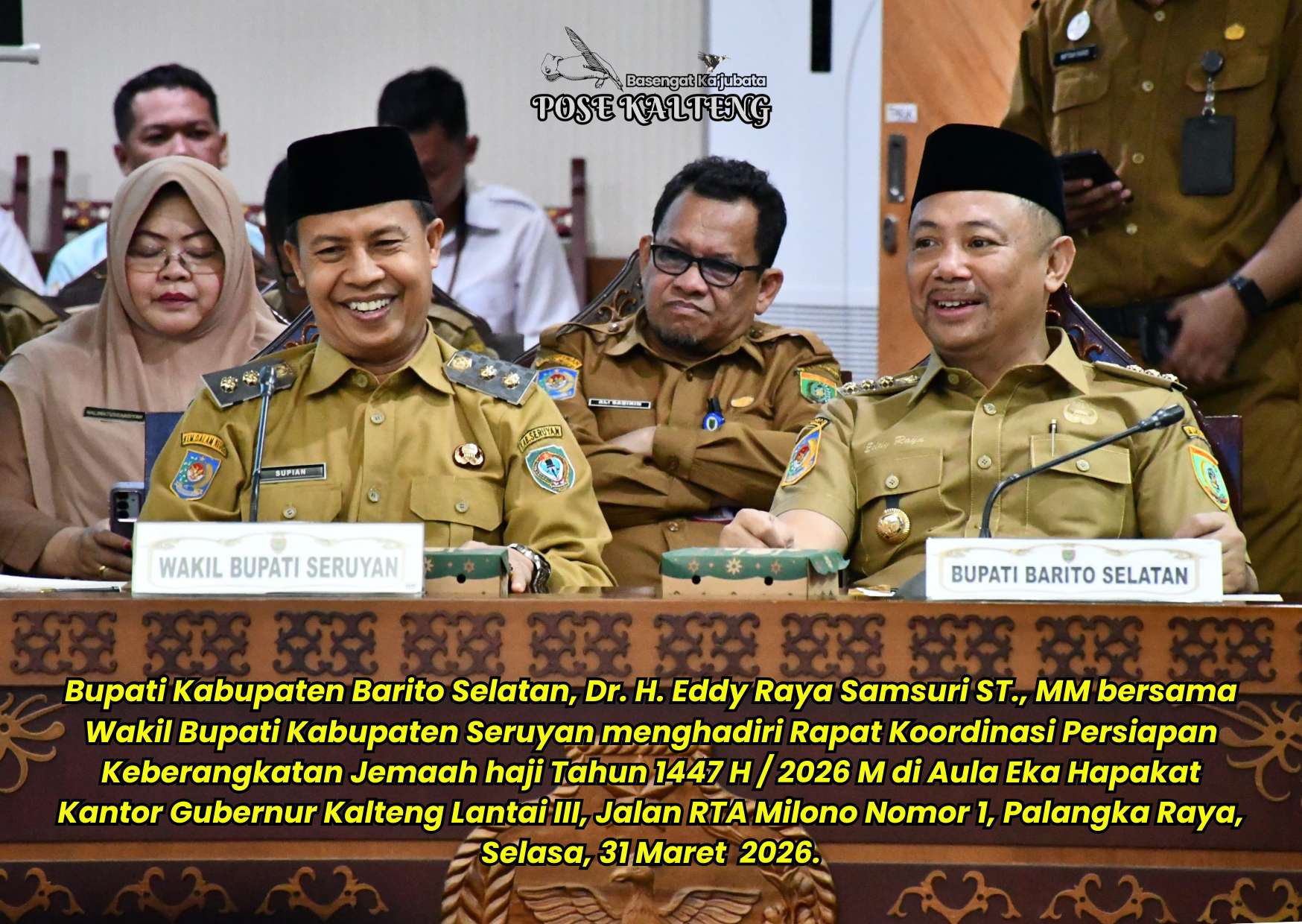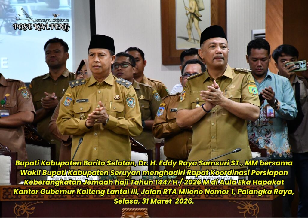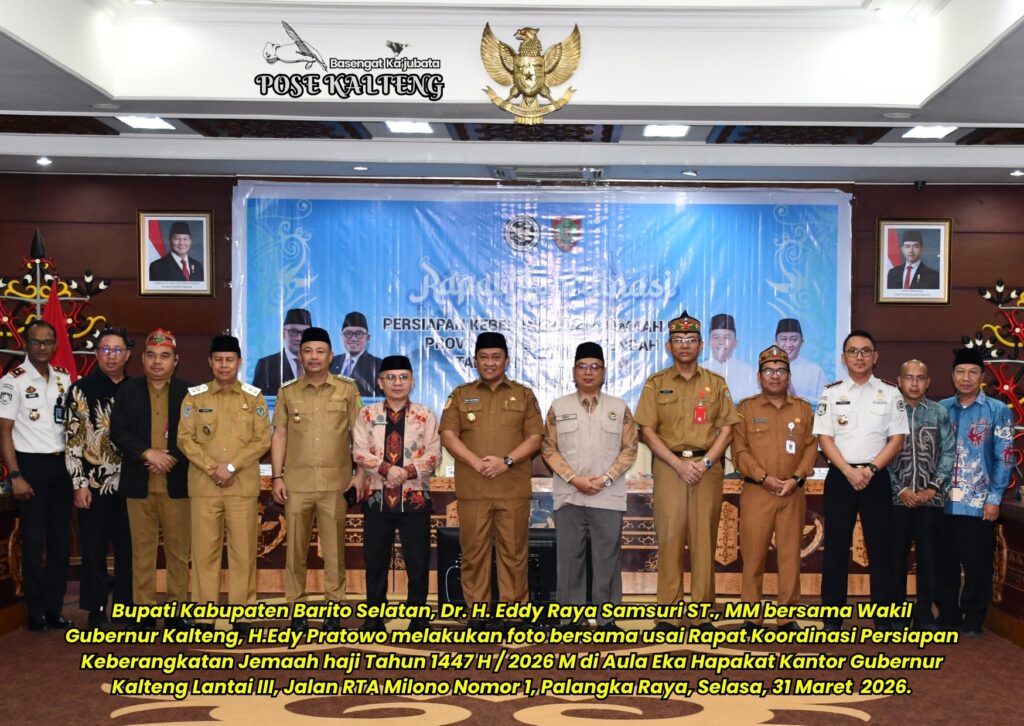 POSE KALTENG, Palangka Raya – Bupati Kabupaten Barito Selatan (Barsel), Dr. H.Eddy Raya Samsuri S.T., MM menghadiri Rapat Koordinasi Persiapan Keberangkatan Jemaah Haji tahun 1447 H / 2026 M di Aula Eka Hapakat, Lantai III Kantor Gubernur Kalteng, Jalan RTA.Milono nomor 1 Palangka Raya, Selasa, 31 Maret 2026.