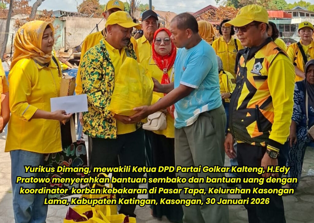 Yurikus Dimang mewakili Ketua DPD Partai Golkar Kalteng, H.Edy Pratowo S.Sos., MM bersama rombongan kader Golkar sejak pukul 08.00 WIB dan tiba di Kasongan pada pukul 09.00 langsung menghampiri warga yang terdampak musibah sebagai wujud kepedulian DPD Partai Golkar Kalteng terhadap masyarakat.