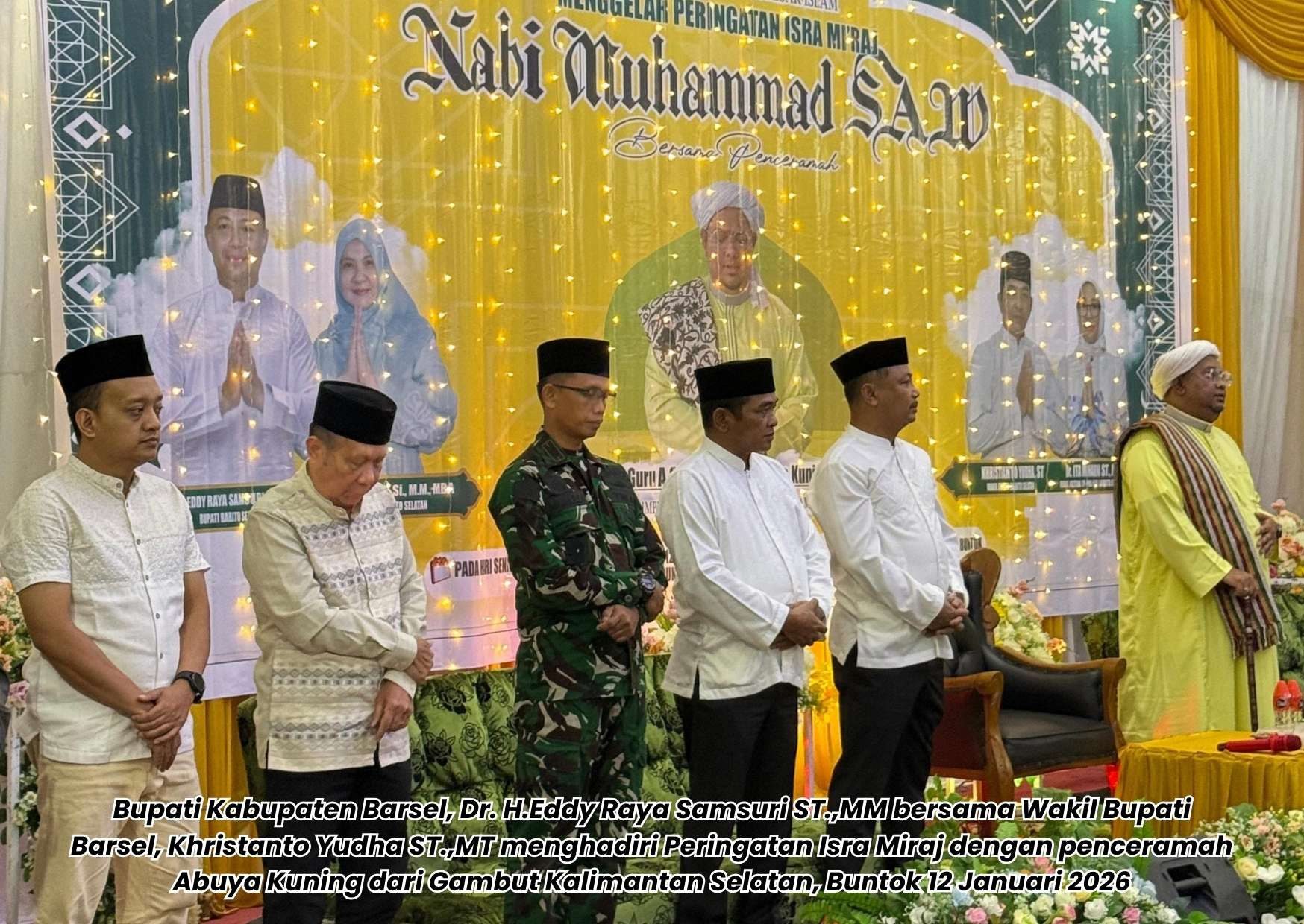 POSE KALTENG, Buntok – Bupati Kabupaten Barito Selatan (Barsel), H.Eddy Raya Samsuri dan Wakil Bupati Barsel, Khristanto Yudha kompak mengahdiri Acara memperingati Isra Miraj Nabi Muhammad SAW 1447 H yang bertempat di Masjid Agung Baiturrahman, jalan Pelita Raya, Buntok, Senin malam 12 Januari 2026. Acara tersebut digelar oleh Pemerintah Kabupaten (Pemkab) Barsel bersama Panitia Hari-hari Besar Islam (PHBI) Kabupaten Barsel.