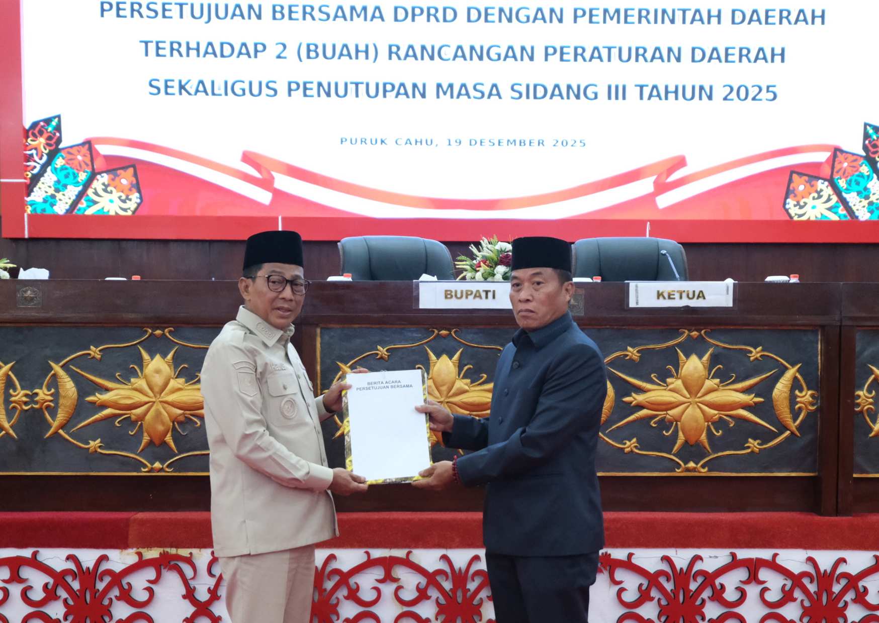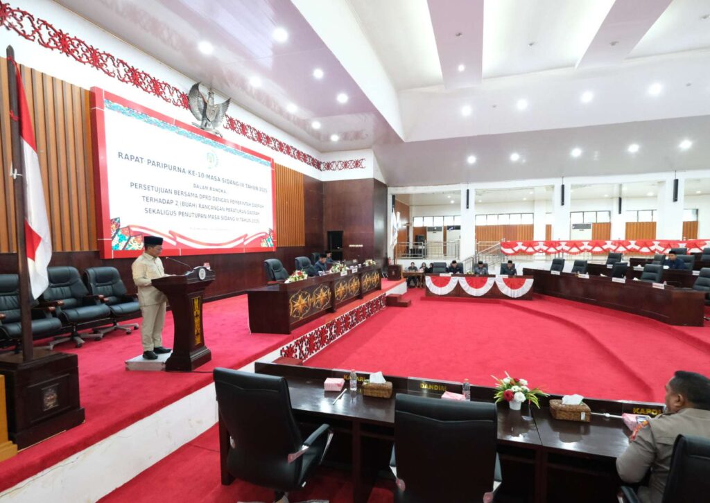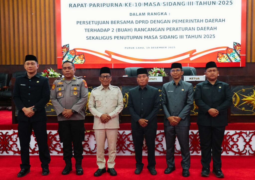 POSE KALTENG, Murung Raya – Pemerintah Kabupaten Murung Raya (Pemkab Mura) bersama Dewan Perwakilan Rakyat Daerah (DPRD) Kabupaten Mura mencapai persetujuan bersama terhadap dua buah Rancangan Peraturan Daerah (Raperda) dalam Sidang Paripurna ke-10 Masa Sidang III Tahun 2025 yang digelar di ruang Rapat Paripurna DPRD Kabupaten Murung Raya, Jumat 19 Desember 2025.