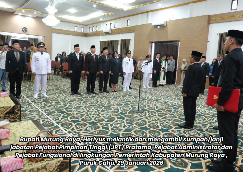 POSE KALTENG, Murung Raya – Bupati Murung Raya, Heriyus, secara resmi melantik dan mengambil sumpah/janji jabatan Pejabat Pimpinan Tinggi (JPT) Pratama, Pejabat Administrator dan Pejabat Fungsional di lingkungan Pemerintah Kabupaten (Pemkab) Murung Raya (Mura),