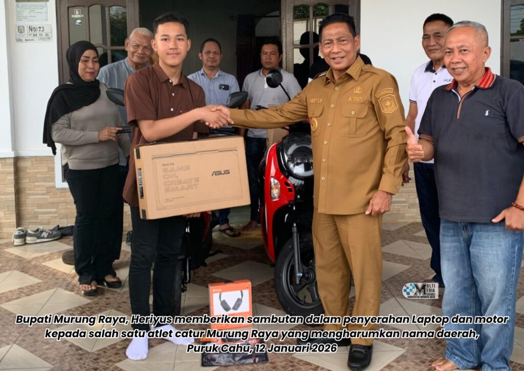 POSE KALTENG, Palangka Raya – Bupati Murung Raya, Heriyus, menyerahkan bonus kepada atlet catur berprestasi berupa dua unit sepeda motor dan satu unit laptop, Senin 12 Januari 2026. Penyerahan bonus tersebut dilaksanakan di kantor Sekretariat DPC Partai Gerindra Kabupaten Murung Raya.