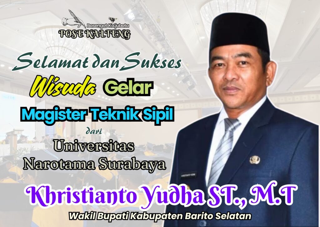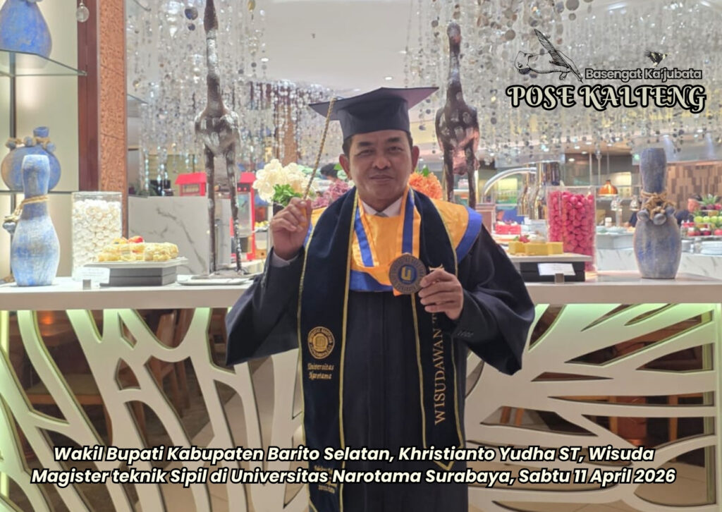 POSE KALTENG, Surabaya – Wakil Bupati (Wabup) Kabupaten Barito Selatan (Barsel), Kristanto Yudha ST berhasil menamatkan kuliah Magister Teknik Sipil di Universitas Narotama Surabaya (UNNAR). Waisuda berlangsung di Surabaya, Sabtu, 11 April 2026.
